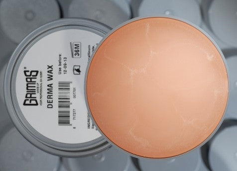 Grimas Derma Wax es una cera transparente, fácilmente moldeable que se adhiere bien a la piel, para efectos de maquillaje, con la cual se pueden hacer varias heridas y deformaciones en la piel.